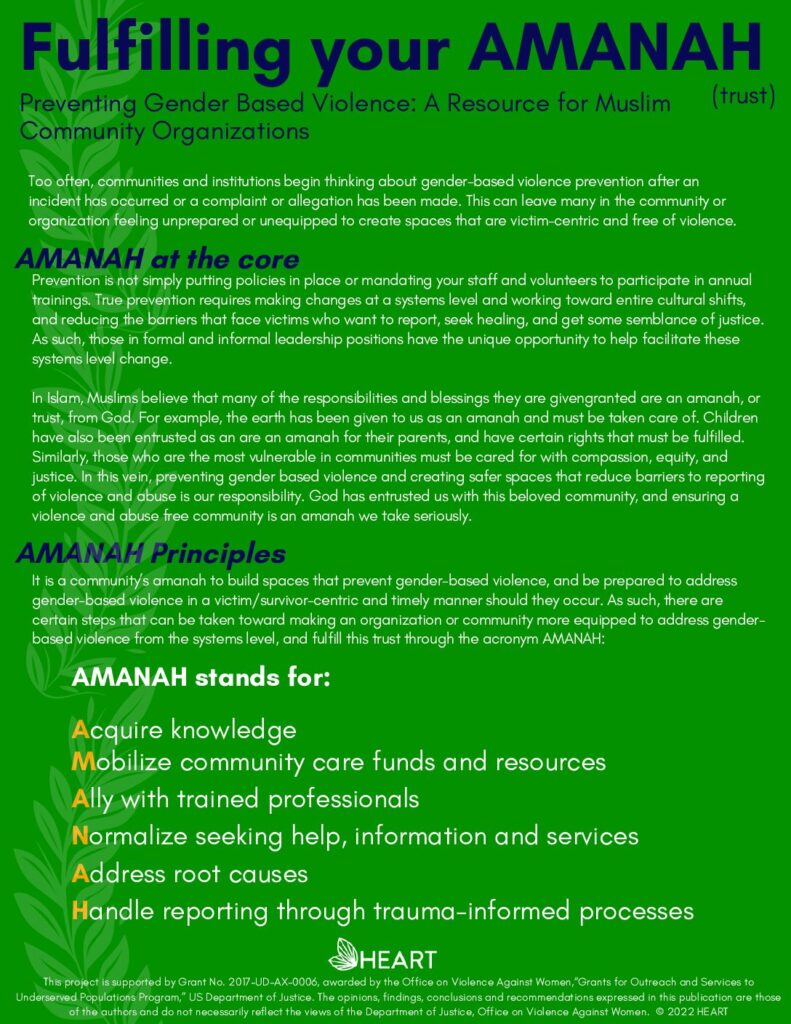 In addition to responding to individual victims with RAHMA, communities can work toward proactive prevention through the AMANAH framework. In Islam, Muslims believe that many of the responsibilities and blessings they are granted are an amanah, or trust, from God. In this vein, preventing sexual violence and responding to a disclosure of sexual assault, whether as an individual, and especially as a community or institution, is a great amanah.