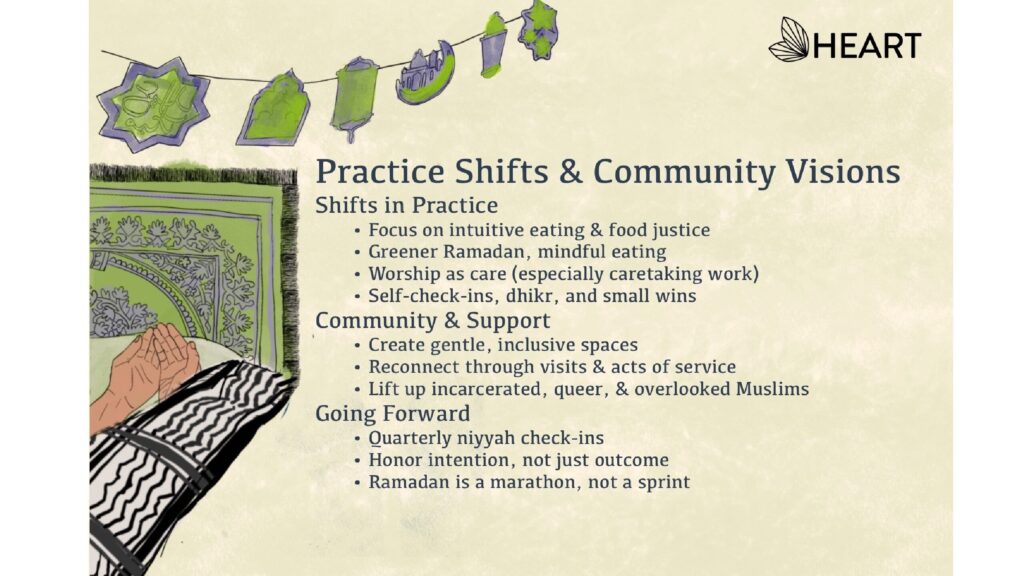 Over four weeks, Muslims from all around the world gathered in virtual community to renew our individual and collective niyyah (intention) with HEART Chaplains, Seher and Amany. In this virtual space, we heard stories about the Prophet (pbuh), women in Islamic history, and more, as well as reflected on thehttps://hearttogrow.org/resources/niyyah-worksheets/NIYYAH worksheet. This year, we were also lucky enough to have a graphic illustrator summarize and illustrate some of the key takeaways from this blessed space.
